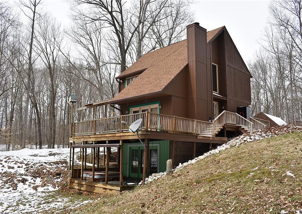 Sunrise to Sunset - the year around views from every window of this 3BR 2BA Contemporary home on a wooded lot overlooking the pond are spectacular! Gorgeous living room w/cozy wood-burning fireplace, updated kitchen w/all appliances & tiled dining room, wrap-around deck, stained trim, full basement w/family room, bonus room & sitting/sunroom w/hot tub hook-up, access to 18 acre Lahr Lake and 2-car detached garage w/wood stove. Anderson windows, newer roof & HVAC. You are finally HOME!!