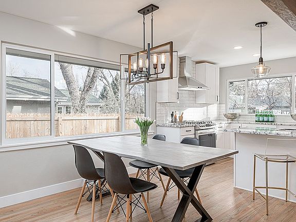 Inspired by a modern rustic aesthetic + the ability to entertain, this Holly Hills home balances inviting finishes w/ crafted elements on nearly an acre lot. Upon entry, residents and visitors are greeted by a living space anchored by a wood burning fireplace that is crowned by a reclaimed mantel. Oak floors run underfoot, wrapping around to a spacious dining + kitchen area boasting brand new appliances, an expansive island + black brushed finishes. Equipped with a sitting area, torrents of natural light + 4-piece bathroom, the primary suite is a serene haven for owners. A fully finished basement lit by recessed lighting + egress windows extends the livable area of this home with a motif that mimics its upper-level counterpart. Outside, a dreamy + commodious backyard oasis unfurls, where a zero-transition patio sets the stage for gatherings of all sizes. A pass-through kitchen window + connected bar top overlooks the lush outdoor haven, where endless soirees are imagined under the Colorado sky.
