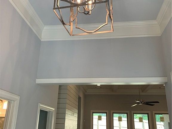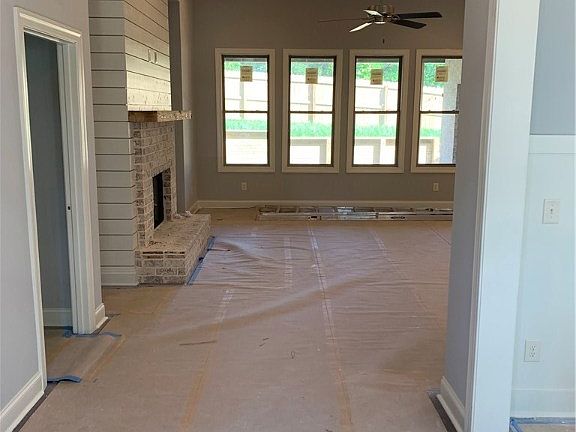 This spacious floor plan is open and flowing throughout. Coffered ceiling in great room along with a brick fireplace, shiplap and rustic mantel beam. Custom cabinets throughout house with handcrafted vanity in half bath. Vaulted ceilings with exposed beams in Master BR.Master Bath has His & Her Closets. Most all rooms on main floor, Spacious laundry with mud room / drop zone hall tree and utility sink. Large pantry just off kitchen, grand island. Outside rear covered porch is Wired for TV. Great place to relax or entertain. Double car over sized garage with court yard entrance. Quiet cul de sak with a Large 1.3 acre wooded lot that backs up to the Golf Course. Upgrades abound in this wonderful, open concept floor plan. Beautiful exterior finishes. Solid Fiberglass front door That will last a lifetime.