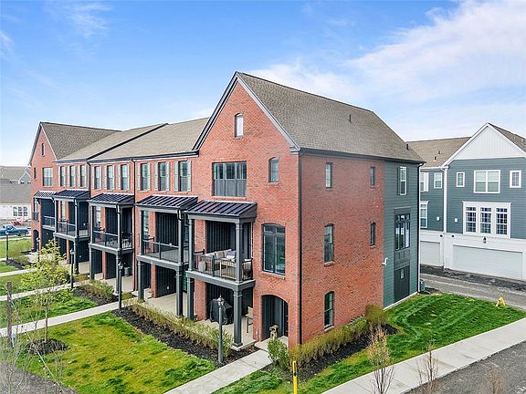 VIEW VIRTUAL TOUR LINK FOR HIGH RES PHOTOS. END UNIT Brownstone w/tons of curb appeal, 2 covered outdoor spaces, side yard, & an immense amount of natural light. Walkable community of Hastings offers brewery, restaurant, salon, coffee/juice shop, yoga studio, veterinary clinic, walking trails, playgrounds, & 30min to Downtown Pittsburgh! This end unit is loaded w/upgrades & offers one of the more modern floorplans in the community. It boasts not only 3bd, but also a bright office w/glass door on the main floor, & the 1/2 bath is tucked down a separate hallway as opposed to other units where it is right in the living space. The 1st floor was upgraded w/finished bonus room option & wet bar, quartz, & beverage fridge. Kitchen boasts quartz counters, sleek appliances, hood vent, & spacious pantry. Dining room has 2 massive picture windows & plenty of room for large table. Inviting covered porch, 8ft doors on main floor, laundry on bedroom level, luxurious primary suite has walk in closet.