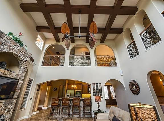 - Interior Features: Ceiling Fans(s), High Ceiling(s), Master Bedroom Downstairs, Split Bedroom, Walk-In Closet(s), Solid Wood Cabinets, Window Treatments, Cathedral Ceiling(s), Coffered Ceiling(s)