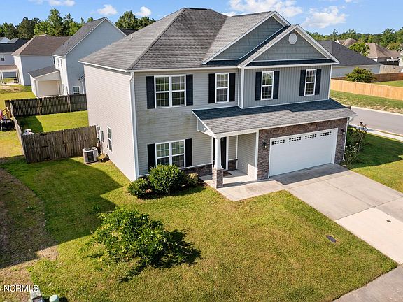 Four Bedroom two story available in desired area of Hardee Farms Subdivision! This home offers space to fit a new owners' needs. Entering the home, you have a living room (offering optional usage) with coffered ceilings, chair rail and wainscoting. This beautiful trim work continues into the formal dining room. Open Kitchen with loads of cabinetry, center island and pantry for more storage. Refrigerator conveys with home. Small breakfast nook off kitchen with SGDs leading out to completely fenced in backyard, patio w/pergola for great entertaining space. Large family room with an electric fireplace for ambience. There is a half bath on the main level for guests and convenience. Up the stairs, opens up to bonus space great for play area/home office, etc. Laundry room is located conveniently on the second floor and washer/dryer set convey with home. Master Suite offers beautiful trey ceiling, large walk in closet and private bath with step in shower, soaking tub and dual sinks vanity. Three other bedrooms upstairs and a hall bath. Desirable location with a quick drive to downtown New Bern as well as to MCAS Cherry Point.