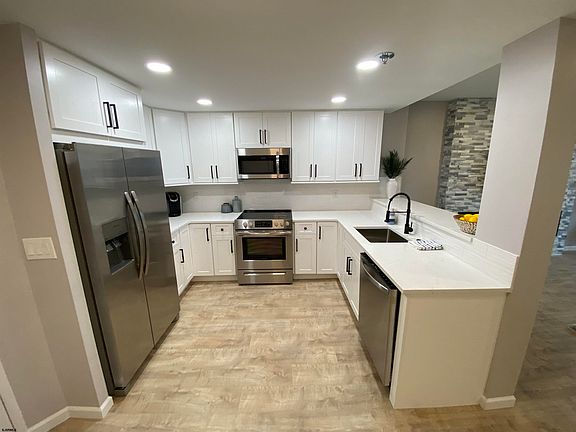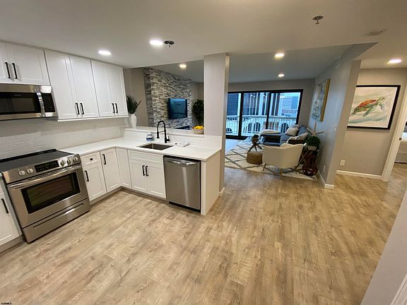 Come see an Ocean View fully renovated 1 Bedroom – 1.5 Bathroom that was completely gutted and rebuilt with a fresh contemporary design. Located on the South side of Tower 2 with a sliding door that opens up to a balcony with that sits high above surrounding buildings with fantastic ocean views and giving you views all the way to Longport. Interior is renovated with high end finishes throughout with attention to every detail. All the original concrete ceilings throughout the unit were framed for drywall to allow for ample recessed lighting in every room. New designer horseshoe kitchen made of white shaker cabinets, quartz counter tops, subway tile backsplash and stainless-steel appliances opens up to the main living area centered around a large Alaskan Grey ledgestone fireplace with 76” wide linear electric fireplace unit with multiple flame colors and heating options. Accent walls add custom touches throughout the unit and luxury engineered vinyl plank flooring covering the foyer, kitchen, bedroom and main living area is waterproof and scratch & dent resistant. The powder room right off the entrance door is perfectly finished with a modern vessel sink and hexagon tile accent wall. Next to the powder room is the new washer/dryer and new thermostat that controls your fully conditioned unit. The large master bedroom has plenty of room for the large king bed, separate seating area and a small computer desk to allow for the convenience of working-at-home. A long hallway leading to the bathroom consists of a double slider with hanging rod & shelf to hold your beach wardrobe. The master bathroom is very well done using modern porcelain tile and a frameless glass door shower with a custom double vanity with a separate private toilet room. Meticulous well-kept lobby, community room, ocean front pool and gym give you all the amenities you could want in a beach home including an on-site restaurant and the option to register multiple vehicles to park in the attached building parking garage. Great secure location and close proximity to all of Atlantic City has to offer, A must see! At an agreed price it could be sold fully furnished! NOTE: Monthly association fee includes a special assessment fee that is currently being charged.