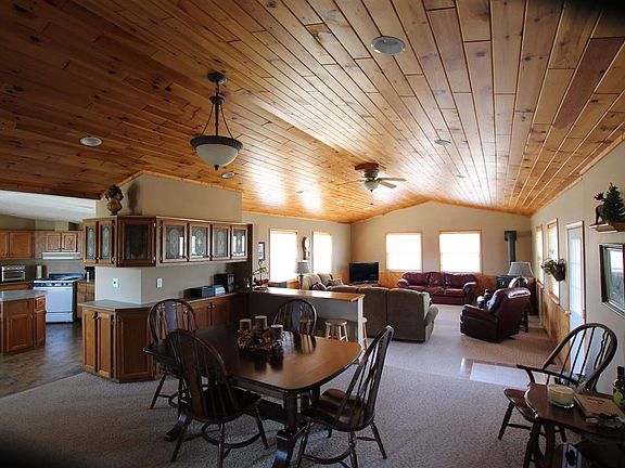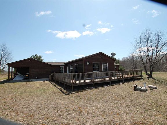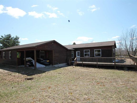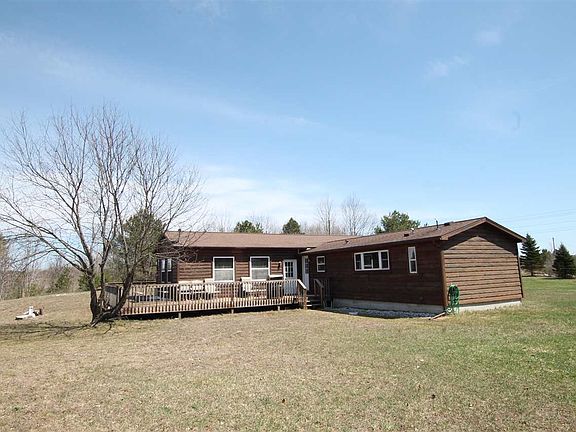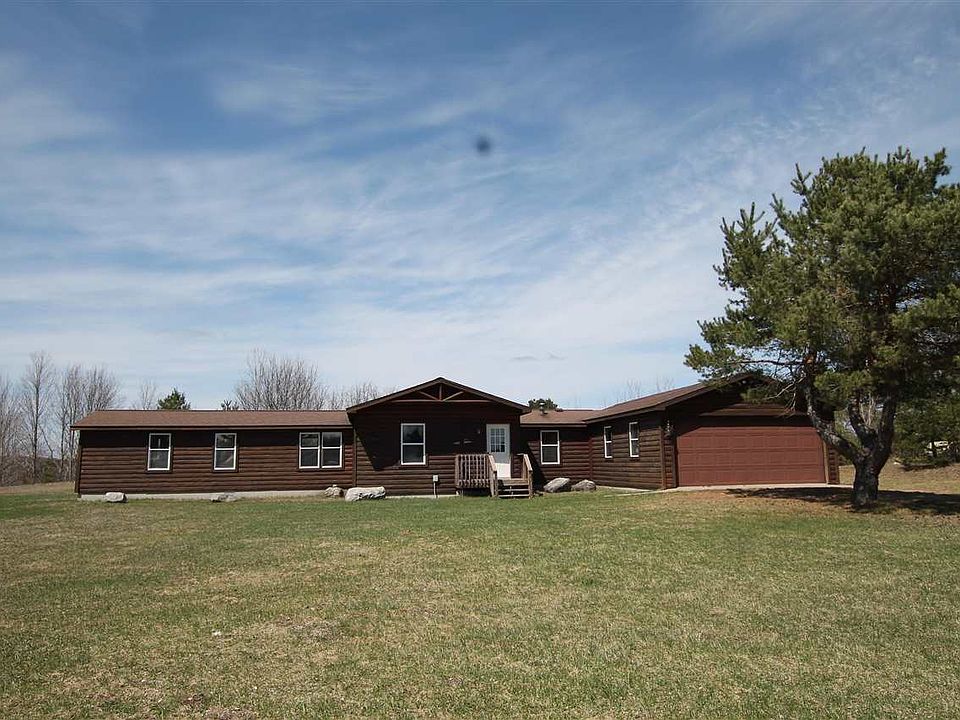 Country living awaits you on this beautiful 11 acre hilltop property including a very comfortable 4 bedroom 2 bath home in exceptional condition. Very spacious home offering 1,820 sq. ft. of living area with a 20' X 24' bonus room for entertaining or just relaxing with a cathedral ceilings that are beautifully finished with tongue and grove pine. There is a finished 2 stall attached garage that offers you the ability to drive completely through the garage with a snowmobile or a motorcycle with an overhead door at both ends! Speaking of snowmobiling there is a trail on the north end of this property that leads you to the State Snowmobile Trails system just 2 miles away! If you enjoy grilling or entertaining outdoors you will be pleased to see this home has a wrap around deck that offers you 880 sq. ft. of outdoor area to enjoy those summer breezes and sunsets, or to view the millions of bright stars above after the sun goes down.