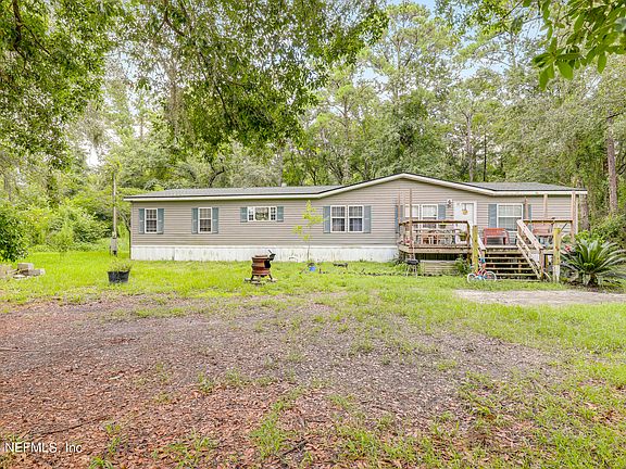 Escape to 2 acres of tranquility! This spacious 4-bedroom, 2-bathroom home boasts huge living areas with plush carpeting, a formal living room, and ample storage throughout. Unwind in the master suite featuring a spa-like bathroom with a walk-in shower, a huge soaking tub, and 3 vanities. Enjoy quiet mornings on the expansive deck overlooking your huge, shaded front yard. The functional split-bedroom floor plan ensures privacy, while the conveniently located laundry room with cabinets and countertop adds ease to daily routines.This property is perfect for veterans and their families, with close proximity to the Department of Veterans Affairs and Jacksonville National Cemetery. Relax in your very own man cave/she shed with plumbing and electricity, or venture out to nearby Jacksonville International Airport and major highways for easy commutes. This home could be your own private oasis. Don't miss this opportunity - schedule a showing today!
