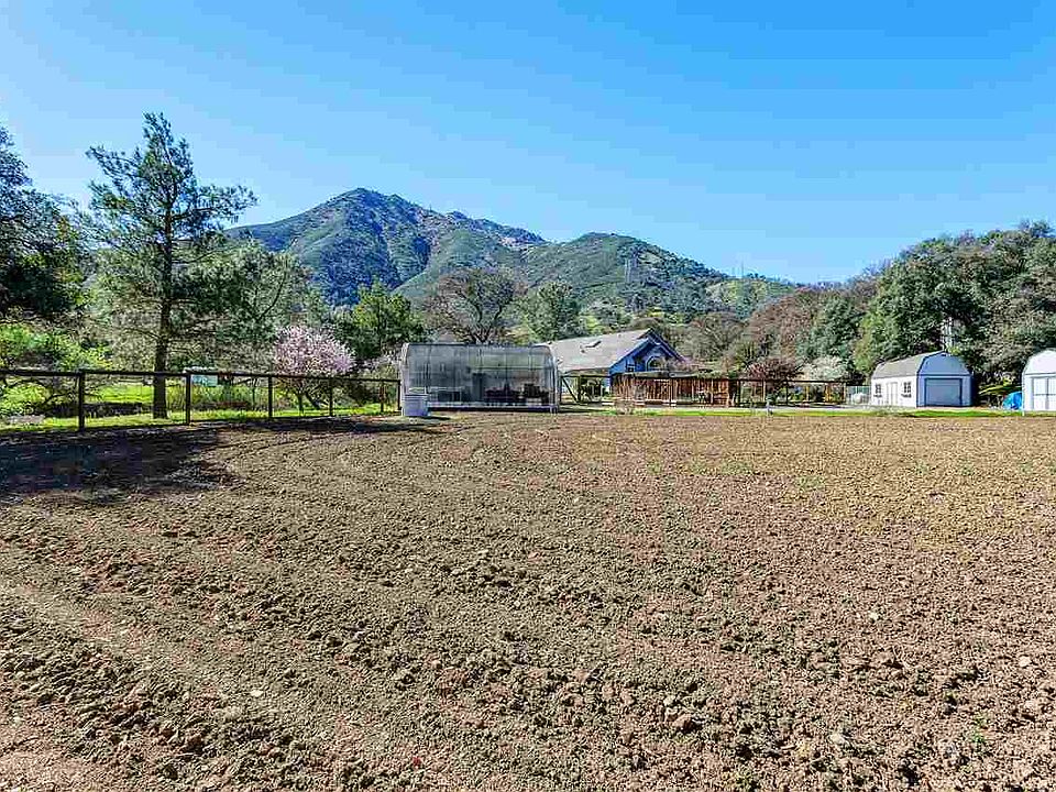 If you are looking for flat acreage look no further! This elegant single story home is located down a private driveway. Boasts large rooms. Remodeled kitchen with solid surface counters, Miele stainless steel appliances, gas stove, double ovens, steamer and warmer. Large pantry. Light filled breakfast nook. Family room with stunning floor to ceiling brick fireplace and Lit built-ins to display your treasures. Wet bar with sink and fridge. Formal living room with fireplace. Formal dining room. 4 large bedrooms, one with slider to private patio. Generous size master suite with wall of windows looking out to the gardens, pond and water feature. Master bathroom with sunken tub with picture window to garden, walk in shower, two separate sink/ dressing areas and large walk in closet. The property is wonderful. Sides to seasonal creek. Orchard with raised beds. Outfitted greenhouse ready to start your growing season. Workshop. Storage shed. Water storage tank. Flat pasture. Views. City Water