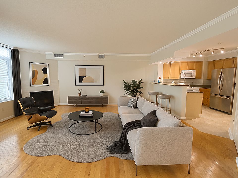 Luxury High Rise Unfurnished apartment for rent, right off of I-395 @ King Street HUGE 1 bedroom 1 bath with over 800 sq feet of living, gas fireplace, 2 ample closets in bedroom plus large hall closet. Laundry in unit, Kitchen counter/bar, granite countertops; newer fridge & dishwasher. Maple hardwood in living areas, and carpet in the bedroom. has a balcony; 1 parking space included & other spaces available for rent in the building. Amenities include newly renovated party and billiards room, excellent outdoor pool, high end fitness room, 24 hour front desk/concierge, Billiards, Picnic are with grills and fire pit. Pet rent is $35/month + separate annual pet fee to the building.