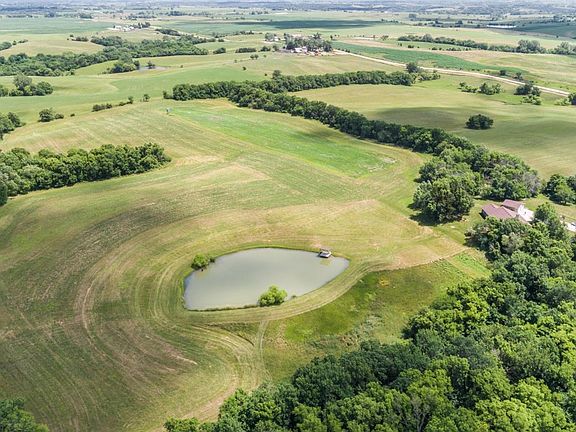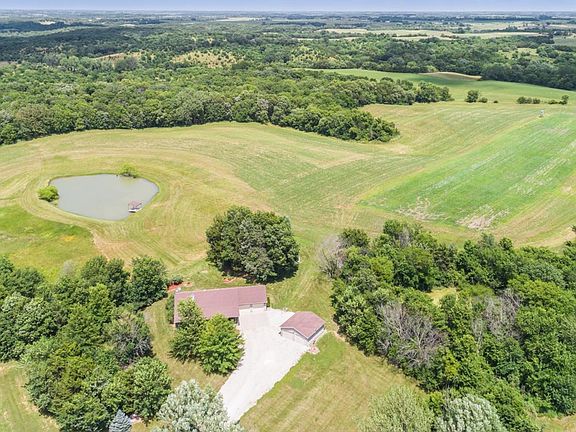 Fantastic country home on 46 acres of nature filled land. 22.4 acres of variety of trees; the rest is tillable & pasture. 3/4 acre stocked pond w/wonderful view from the home. Covered fishing dock. Hunters paradise w/deer stands & 3 food plots, wildlife galore. 3 BR ranch home was custom built in 2000. 2 full baths, Master bedroom with en-suite and jet tub, kitchen has cupboards by Schrock, custom made from hickory. Beautiful stone back splash and island surround, dining area w/French door overlooking the pond. Spectacular view. Oak woodwork, country feel everywhere. Geo-thermal heating & cooling, such a plus and savings. Home comes w/appliances & also a generator for country convenience & a gas stone fireplace. Poured concrete covered front porch, great for watching the nature. Attached 2-car garage & detached 24x24 2-car with heat, AC, ceiling fan & insulation. 2-10x14 Kaufman buildings, 2 raised gardening beds, many new trees, apple, pear, mulberry & maples. Full basement. Seller