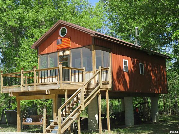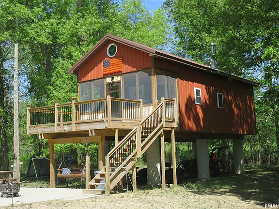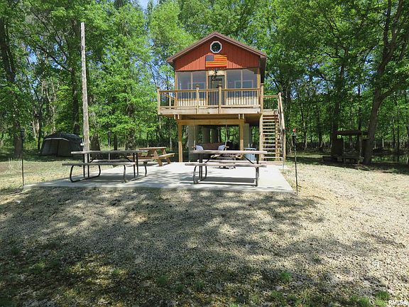 Well Built furnished Cabin built in 2020 with 6.28 acres that has river access via flat boat (Refer to the GIS Map online to see the access). Property features a bedroom, bathroom, eat in kitchen, open living/dining area, wood burning fireplace, 100 amp electric service, Heat pump, Ductless Central Air, Water Tank, electric Toilet, screened in front porch and a large 10' x 16' deck. Also features, a 20' x 25' cement patio with picnic tables with water views, wildlife, fishing, wooded areas and 3 trails to enjoy. Property has 3 camper hookups with 30 amp service each. Sellers are including: kayaks, small bass pontoon, pedal boat, Golf Cart, Small Trailer, 4 Picnic tables, burn pit, wood swing, trail and security cameras, and all furnishings stay (except for wifi). Sellers also used an enclosed trailer for storage and 2020 John Deere 1025 - which will be sold separately. Buyer will have the first option to purchase both from seller. Property goes to the gate further down on the road from Washington Blvd. State owns between two gates and power company maintains trees on the property and power lines. Fiberoptic lines are also maintained by their provider also. If flood stage hits 20', water is over the concrete, but has never touched the cabin. 2023 flood level is marked under the cabin behind the swing. 2023 flood level was 5' 4" under the cabin. Schedule your showing today!