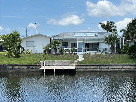 Experience waterfront living in this 3-bedroom, 2-bath split floor plan pool home in Cape Coral. Situated on a canal with access to the Caloosahatchee River, this property is full of character and charm. The kitchen features solid maple cabinets, a vintage stove and oven, and a stainless steel refrigerator. An enclosed lanai with wood beam ceilings and a brick wall provides a cozy space for relaxing or entertaining. Large pocket sliders open wide to seamlessly connect the lanai to the pool area, creating an ideal indoor-outdoor flow. Natural light fills the home throughout the day. The split floor plan offers privacy, with the primary suite including a walk-in closet, a sink with a vanity, and a separate room for the toilet and shower. The second bathroom also provides convenient access to the pool area. A two-car garage completes this well-designed home. Outside, enjoy a seawall and sitting area by the canal—perfect for fishing, reading, or watching the boats go by. Enjoy peaceful mornings by the water, afternoons by the pool, and the laid-back Florida lifestyle you’ve been looking for.