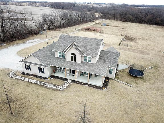 QUIET, PEACEFUL, COUNTRY LIVING....only 3 miles from town! Check out this beautiful, ONE of a KIND, one owner home, built in 2007. Property has 35 ACRES, including FENCED grassland with HEATED water tank for livestock and WOODED areas with creek for hunting. 650 ft. of road FRONTAGE. Featuring a COVERED front & back porch, open vaulted entry, custom cabinets and high-top bar w/ granite counters. LAUNDRY room and half bath next to the kitchen. Natural hardwoods on main level with 9 ft. ceilings. Doors in MBR lead to