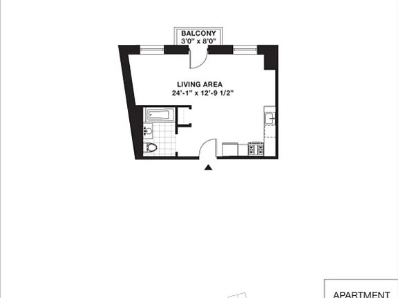 Spacious studio apartment with a separate galley kitchen, and an alcove that can accommodate a queen size bed.