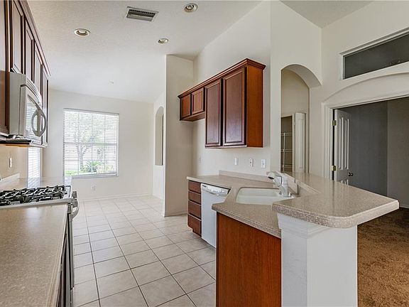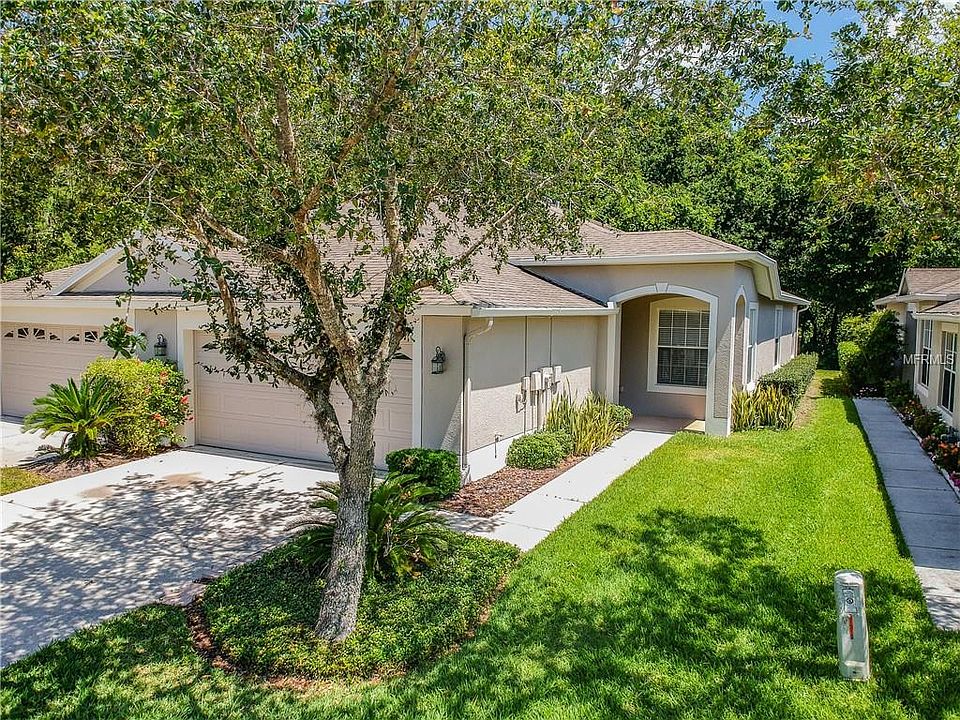 Don't miss this 2 bedroom + Den/ 2 bathroom/ 2 car garage villa in a private GATED COMMUNITY in Meadow Pointe. The beautiful conservation lot is so relaxing with NO REAR NEIGHBORS. You will enjoy maintenance free living in this highly desired Villa Community. Spacious master bedroom has a charming window seat, bathroom with dual sinks, garden tub and walk-in shower. Prepare to be amazed by the enormous walk in closet that is over 16 feet long! Beautiful kitchen with solid surface counters has an eat-in area on one end and opens onto the large living area. There is an alcove off the living area opening onto the rear conservation view patio that is perfect for a home office space or relaxing sitting area. Full size refrigerator located in the garage stays with the house! Gas Hot Water Heater replaced last year. Meadow Pointe community is conveniently located in New Tampa near the Wiregrass Mall, restaurants, shopping and just minutes from the new Premium Outlet Mall. Community amenities include club house with exercise room and pool.