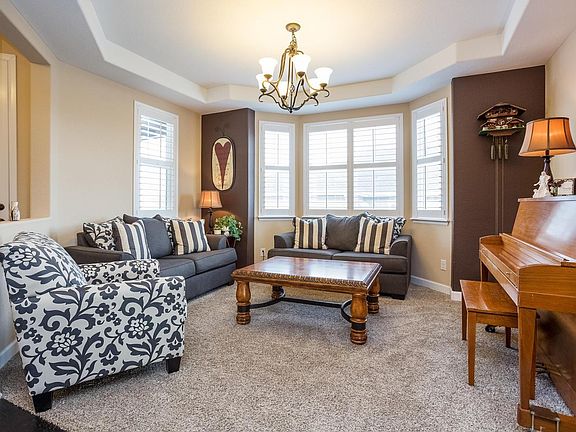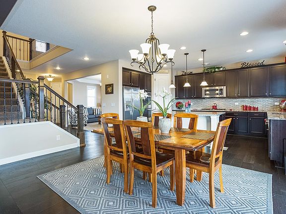 Welcome home! Gorgeous engineered dark oak hardwood floors, a coffered ceiling & plantation shutters invite you into the formal dining room, that could also be a sitting room. Gourmet kitchen equipped with crown molded cabinets, granite countertop, tile backsplash, island, breakfast bar, 5 burner gas cooktop, double oven, & pantry closet. Great room provides a gas fireplace with stone surround & a crown molded wood mantle. Main floor bedroom offers a walk-in closet. Master suite offers coffered ceiling with crown molding & private 5pc bath with soaking tub, walk-in glass shower, dual vanity & 2 walk-in closets. 3 secondary bedrooms also on the upper level; 2 with a shared bath & one with an ensuite guest bath. Finished basement includes rec room, family room, bedroom, ?? bath & lots of storage. Exterior living enjoyed on the covered patio & in the delightful yard with professional landscaping. Truly a great home you will want to share with everyone! Views from nearly every window!
