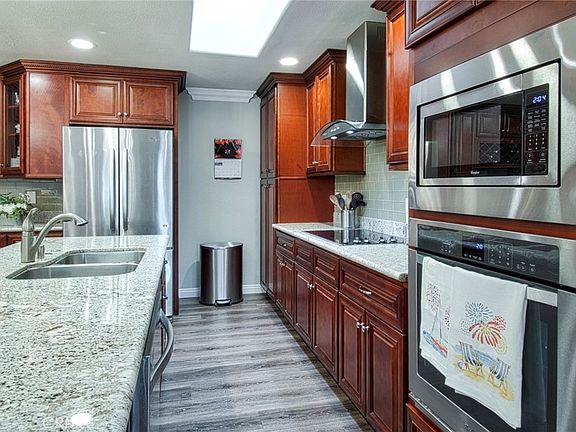 Welcome to this beautifully remodeled "Mariposa Plan" Condo! Step inside and be greeted by the spacious open floor plan, perfect for entertaining guests or for simply relaxing with loved ones. The gourmet kitchen is a chef’s dream, featuring luxurious granite countertops and state-of-the-art stainless steel appliances, complemented perfectly by solid cherry cabinets with quiet close drawers and cabinets. Natural light pours in from skylights, highlighting the gorgeous laminate floors throughout the home. No need to worry about stairs, as this property is a single story-perfect for those seeking the convenience of an easy-to-navigate living space. The master suite offers a spa-like experience with a stunning walk-in shower, providing the ultimate in relaxation after a long day. The central air and heating adds to comfort of this home. This is the perfect home for anyone seeking a modern design, easy living, and comfort all in one. Don’t miss the opportunity to make this beautiful home your own! Laguna Woods is an active, vibrant 55+ community boasting 200+ social clubs, 8 clubhouses, 5 pools, 27 hole golf course, Par 3 course, Tennis, Pickleball, Equestrian center, Library, Woodshop, 800 seat auditorium, and so much more! A free shuttle bus is right at the end of the walkway to take you to all the activities. Dues include: trash, water, landscaping, building maintenance, building insurance, cable TV, security patrol, gated entrances, and access to all facilities. Buyer must meet HOA asset, income, and age requirements. Close to Laguna Beach, local hospitals and medical facilities, easy access to freeways, and local airport.