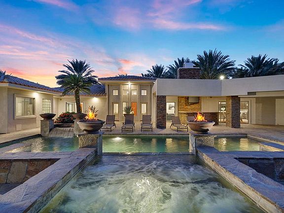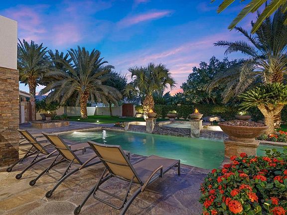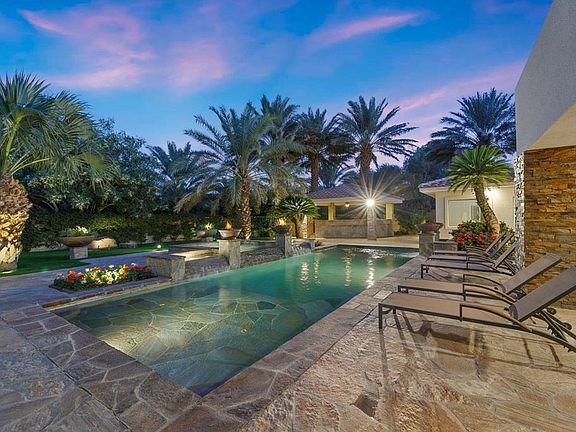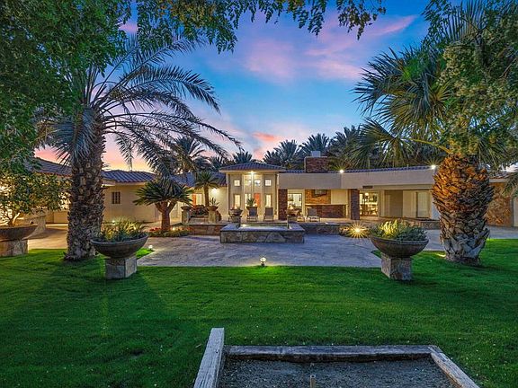 'THE PALMS ESTATE' at Via Las Palmas - this turn key FURNISHED *Short term rental dream house* plus Horse property hits market! This private compound is Approx. 3,700 square feet, 5 bedrooms, 4 bathrooms, pool, spa, plus 3 car garage sitting on +/-3 acres makes this home the epitome of compound luxury living. The interior features high ceilings, stone & wood floors, custom kitchen w/ stone countertops & waterfall edge, high end stainless steel appliances, beautiful cabinetry, walk in pantry, plus top of the line light & plumbing fixtures. The master retreat features direct access to the back yard, sitting room, walk in closet, & an all slate master bathroom. Each of the 4 guest bedrooms are large in size with wood floors and beautiful views. The backyard is the show stopper - Huge pool & spa, outdoor kitchen w/ wood burning pizza oven, 2 different bar areas, multiple fire pits, horse shoe throwing area, outdoor shower, & 100% private! The landscaping is 1 of a kind! Hundreds of date palms - fully lush flowers - every tree, rock, bush, plant has been well groomed. To Top it of the property features its own well that runs all the landscape irrigation. This property is truly 1 of a kind! Welcome home & enjoy life at - The Palms Estate! Call the listing agent for your private showing!