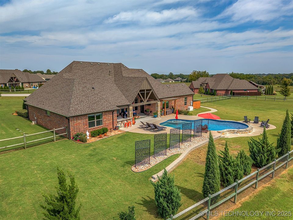 Stunning peaceful park like setting. Single story ranch on 1 acre in cul de sac with pond and green belt view. Wood floors through entry, living, den and halls. Living room with beams, stack stone fireplace, built ins, and wall of windows overlooking beautiful gunite salt water pool and patio. Open kitchen with quartz counters, double ovens, pot filler, wood slat ceiling detail and wonderful walk in pantry. Extended dining area with wet bar/buffet. 2nd living with beamed ceilings could also make the perfect office or playroom. Large powder room and drop zone with cabinet off garage entry. Amazing South facing covered patio with built in outdoor kitchen and grill. Private primary suite with lovely tile walk in shower, soaking tub and double vanities. Dream double racked walk in closet connected to oversized laundry with sink and folding counter. Side entry 3 car garage with extended driveway and easy access for future shop, RV Garage or building. **Additional 1.85 acres available for sale with the home for additional cost.
