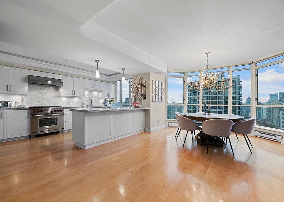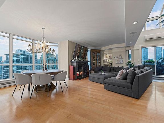 Your home in the sky. Experience unparalleled luxury in this stunning 2-level penthouse spanning almost 1900 sqft with 3 bedrooms, 2 full baths, and expansive double balconies. The main level features house sized living and dining areas, original hardwood floors. The fully redone kitchen** boasts white shaker cabinetry, quartzite countertops, and high-end Miele appliances, Wolf gas range. A grand spiral staircase leads to the private master suite with walk in closet w/organizers**, cozy marble surround gas fireplace**, spa-inspired steam shower w/marble seat bench. Entertain or relax from two oversized patios and take in panoramic city views . This penthouse is a rare gem. Don't miss out on this extraordinary sky home in one of the best Yaletown neighborhoods. Life is better here!