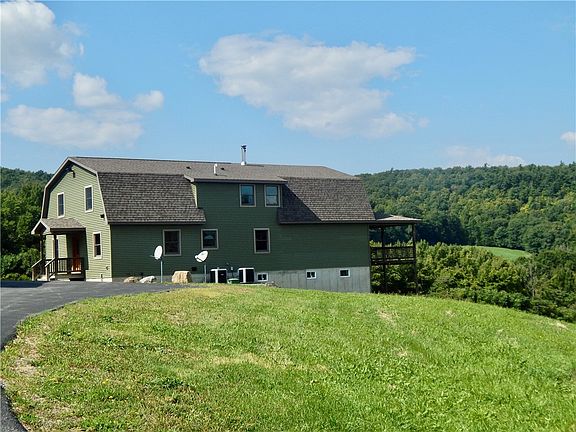 Experience the Pinnacle of Private Luxury Living. This Newer Contemporary 5-bedroom, 3 bath estate is nestled on 150 BREATHTAKING ACRES. Enjoy the comfort and efficiency with a state-of-the-art UNICO HVAC system ensuring your environment is as perfect as the surroundings. The property boasts a MASSIVE 60x100 Morton building, featuring a 30x60 mezzanine, offering endless possibilities for storage, hobbies, or business endeavors. The Pole Barn has its own 22k generator. Step outside to explore your own private woods, winding trails, creeks, ride your atv, snowmobiles and enjoy the excellent hunting. The main house has an OPEN CONCEPT design boasting a Beautiful Top-of-the-line Kitchen, Quartz Counters, LVT Flooring, open to the Living Room, bar area for entertaining. Dining area, wood stove, sliding doors to the wrap around deck overlooking MILLION DOLLAR VIEWS. Separate 4 car garage with finished upper level with radiant heat is perfect for IN-LAW suite, MAN-CAVE, or Art Studio. PAVED DRIVEWAY, additional 18x26 covered shed. Low Taxes. Owners have put OVER 1.6 MILLION in building this exquisite property. This estate is where Luxury meets Tranquility. EXCELLENT VALUE!