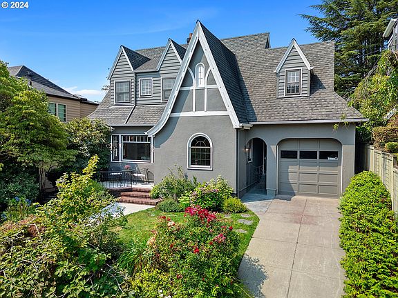 Open Houses: Sat 8/10 & Sun 8/11 ~ 12:00pm-2:00pm. Step into timeless elegance with this stunning English Tudor home, nestled in the heart of Alameda, one of Portland's most sought-after neighborhoods. Built in 1929, this residence seamlessly marries old-world charm with modern luxury, offering an exquisite living experience. The home's rich history is evident in every detail, from the original hardwood floors that grace the main and second levels to the beautifully preserved wood windows that bathe each room in natural light. The kitchen which overlooks the southwest facing backyard was updated in 2021 and provides a perfect blend of classic design and contemporary amenities, making it a chef's dream. Adjacent to the kitchen, the formal dining room exudes sophistication with its custom built-ins, offering both elegance and practicality for your entertaining needs. The nearby sunroom offers a serene space to enjoy your morning coffee, with views of the lush, landscaped backyard.Upstairs, you’ll find three generously sized bedrooms, including a luxurious 25 X 12 Primary and a spacious walk-in closet. The 2nd Floor bath was remodeled in 2024 and is gorgeous with new honed marble floor, subway bath surround and refinished original tub. The fully finished basement adds versatility to the home with a fourth bedroom and third bath, ideal for guests or a private retreat.Outside, the backyard is a true sanctuary, with two inviting patios perfect for entertaining or quiet relaxation. Established landscaping around the perimeter of the fenced property enhances privacy, while the Southwest-facing orientation offers fabulous afternoon sun.Located just a few blocks from the beloved Grant Park and the prestigious Grant High School, this home offers not just a residence, but a lifestyle. Experience the perfect blend of historic charm and modern convenience in one of Portland’s most iconic neighborhoods. It's a must see! [Home Energy Score = 1. HES Report at https://rpt.greenbuildingregistry.com/hes/OR10232024]