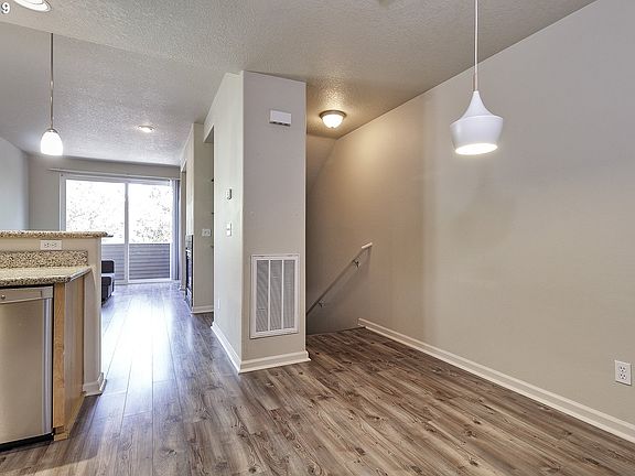 Upscale end unit townhome across from neighborhood park. High ceilings, wood laminate flooring & stone surround gas fireplace in open concept living area. Beautiful kitchen w/slab granite countertops, eat bar & ss appl. Cozy dining nook. Main level bed + full bath. Vaulted master w/walk in closet & shower/tub combo. Spacious 3rd bedroom. Office alcove. Oversized 2 car garage +Fully fenced backyard. Close to Nike, shopping & bus line.