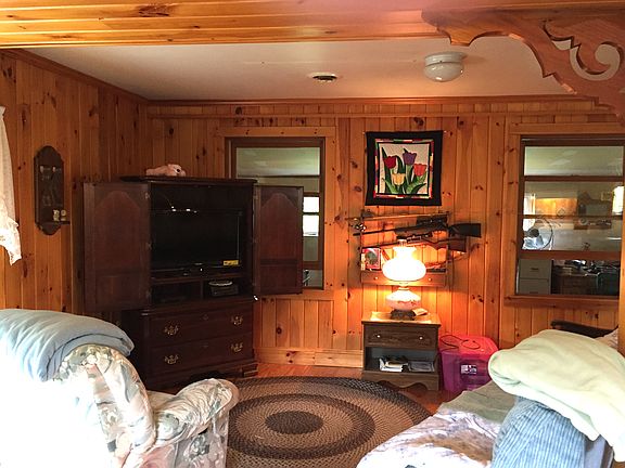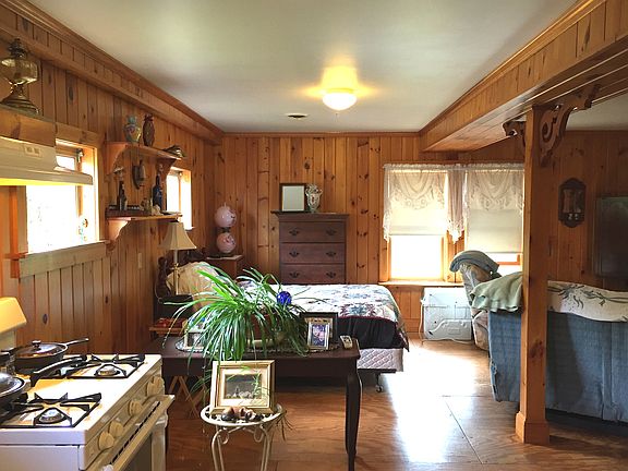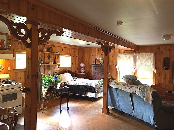 4 acre cabin close to Keuka Lake State Park and Keuka College. Home features open living space, natural wood work, woodstove. Large 2 car insulated garage with heated studio off the back, deck and dock to your private pond make this an excellent place to tinker and enjoy nature. Priced below assessment.