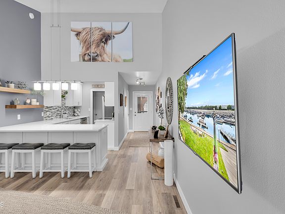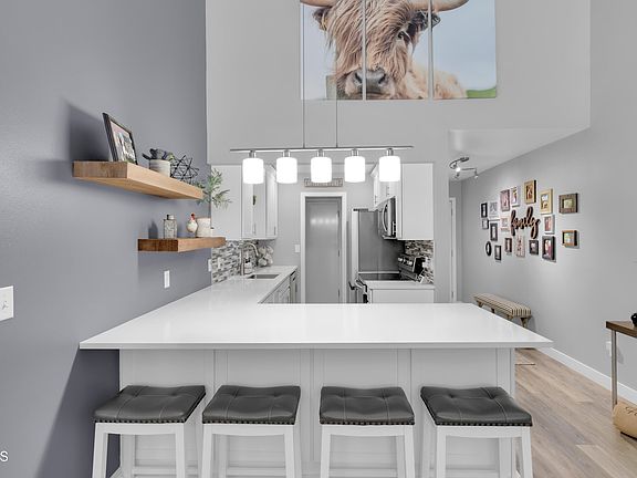 The main floor offers cathedral-style ceilings. This Kitchen was a full remodel meticulously done with that luxurious design. It features soft-close custom cabinets, quartz countertops, a backsplash, floating shelves, new stainless steel appliances, and a pantry.