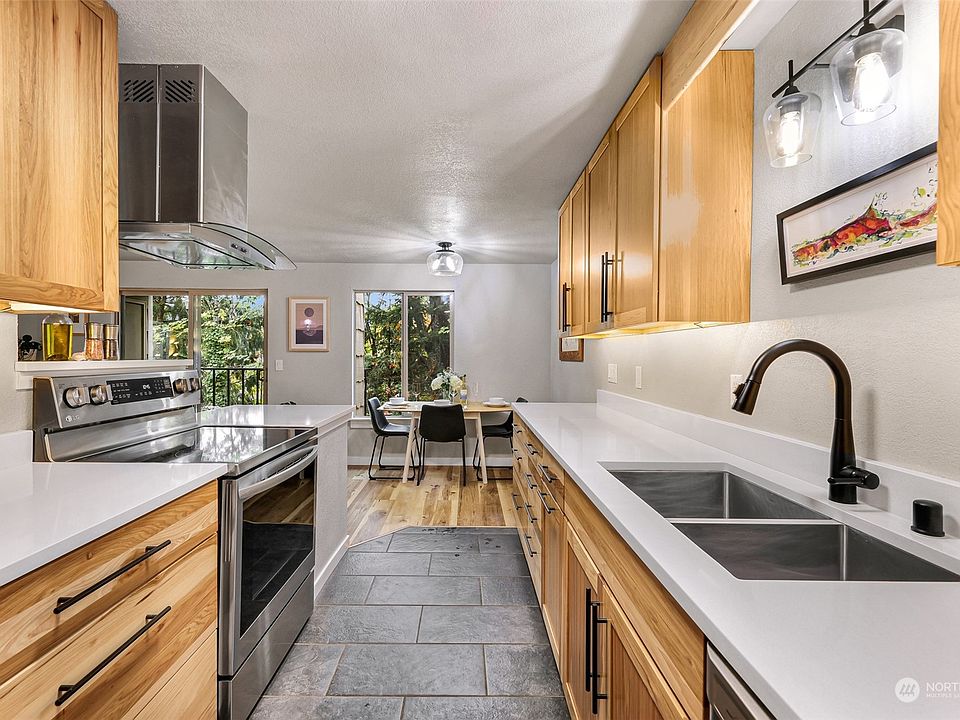 Nestled between Sehome Village & WWU, this 2 bed/1 bath condo in south Bellingham had a top-to-bottom reno in 2021 w/ soft-close solid wood hickory cabinetry, quartz countertops, stainless appliances, radiant heated floors in bathroom, full size washer & dryer along w/ luxury vinyl plank & ceramic tile floors throughout. Even thoughtful touches such as solid wood trim, deep-well undermount sink, LED cabinet accent lighting & popcorn ceiling removal weren’t overlooked. The covered balcony overlooks treed greenspace and you'll love the wood burning fireplace on chilly fall evenings. Perfect for an investment-minded buyer or as a completely turnkey home for someone wanting a prime location, easy access to Fairhaven & the city’s best amenities.