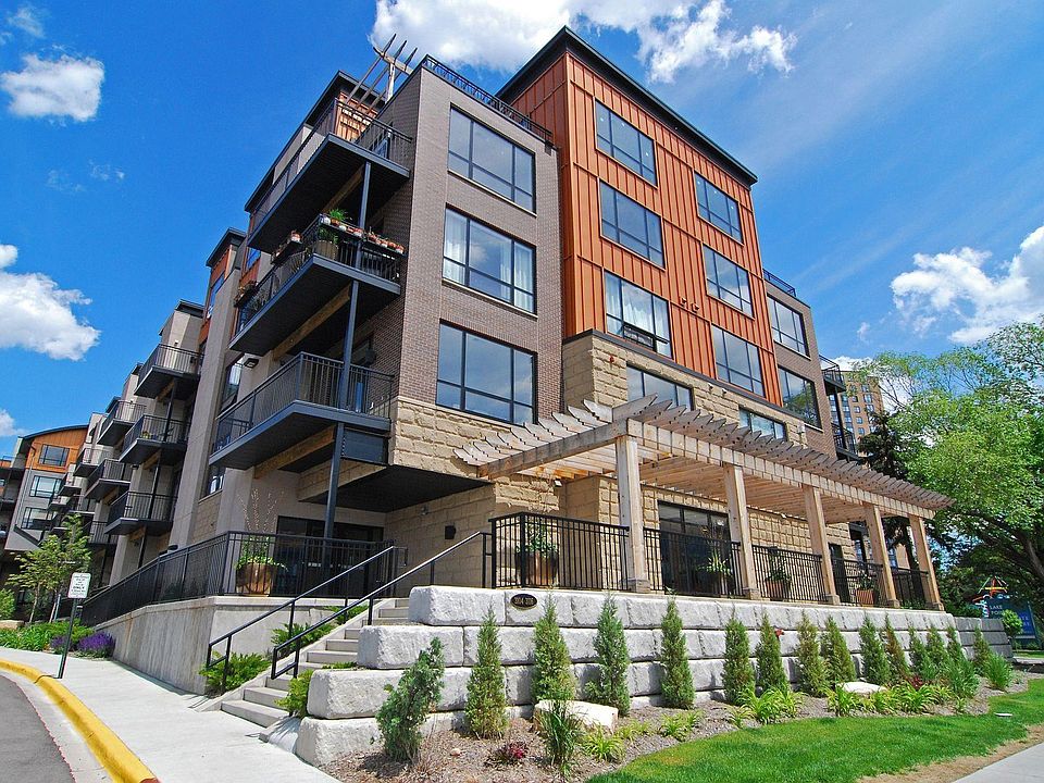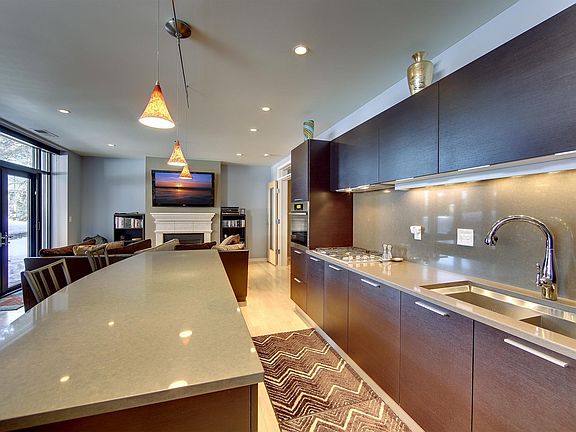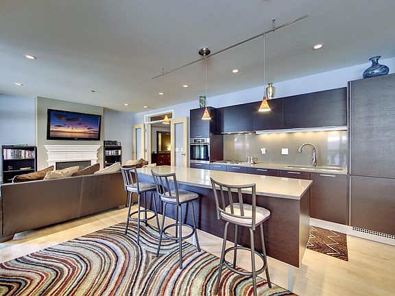 Come see this amazing unit located on the first floor with a walkout perfect for pet lovers only blocks to the lake with your own private patio. The Built-in kitchen appliances are all high end european brands. Enjoy the large windows and custom window shades that complement the unit's modern look and offer plenty of natural light. The kitchen island has quartz countertops with a nice overhang creating a beautiful breakfast nook and seating area. The cozy gas fireplace has a stone surround offers great ambiance for winter nights! The in unit washer/dryer are in a separate room for privacy. The underground heated parking spot is located in the same building with ample space. Enjoy the large gym near the unit on the main floor along with the community room. The bedroom offers french doors that open fully and a large walk-in closet. Throughout the unit you will find beautiful hardwood floors. Do not miss this amazing location blocks to the Lake, restaurants, shops, dry cleaning & more!