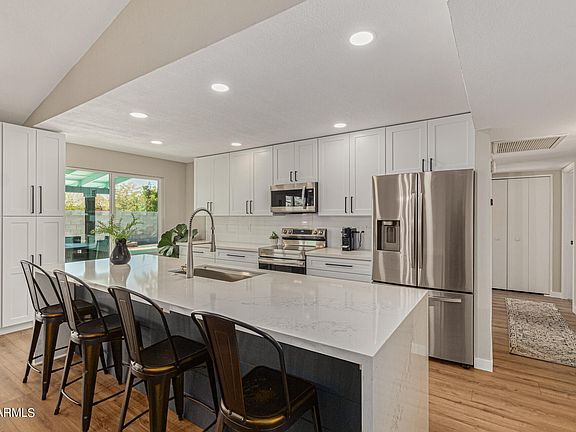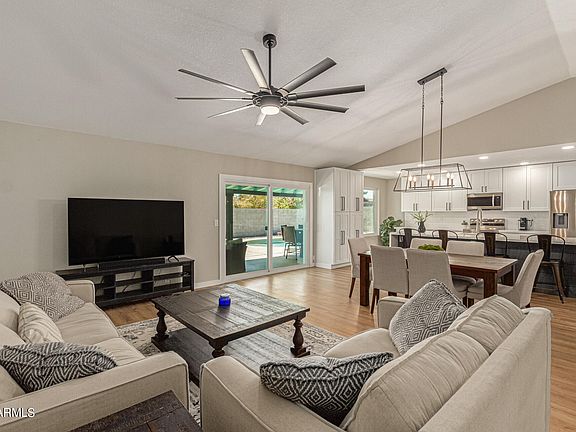This fully remodeled and spectacular home is the one you've been waiting for! Walk in to a gorgeous great room with vaulted ceilings that includes a chef's kitchen with gorgeous white cabinets and an oversized island with quartz waterfall countertops, subway tile backsplash & stainless steel appliances. The primary retreat has a private door to the backyard oasis, a walk-in closet, and tastefully upgraded ensuite. Exquisite luxury vinyl plank flooring throughout as well as all new windows and doors on the exterior. Luxurious light fixtures and ceiling fans throughout...as no detail has gone unnoticed. The lush backyard, with a covered patio, seating areas, turf and a sparkling blue pool is an entertainers dream. All appliances stay. Complete with RV gate and NO HOA! Welcome Home!
