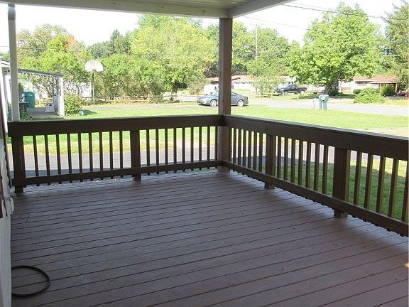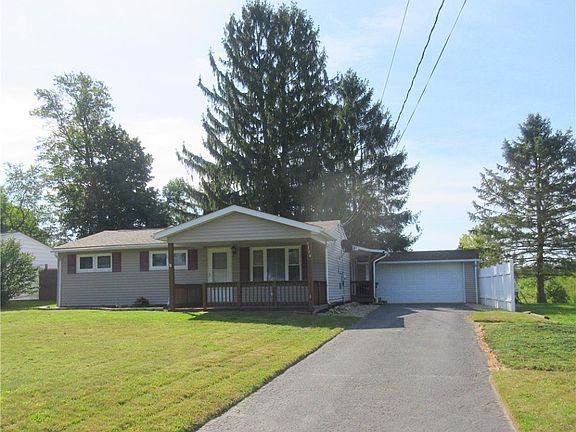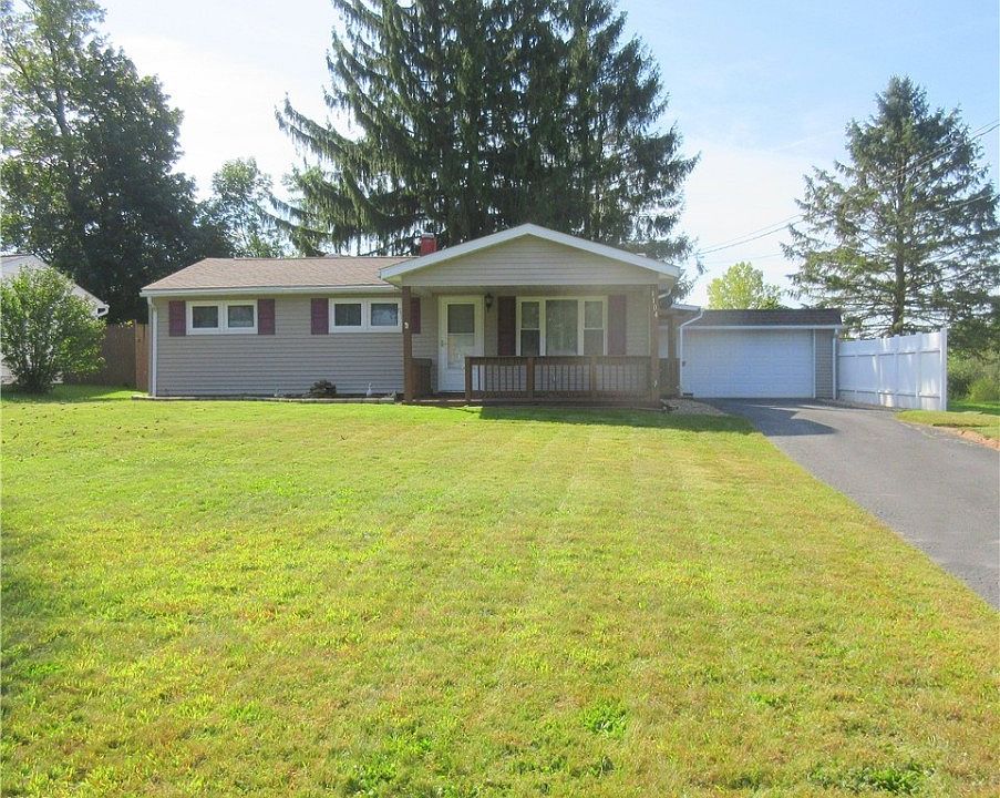 Desirable Open Concept Ranch w/1320 SF, Large Covered Front Deck All on a Quarter Acre Ready to Move Right In! Open Vast Eat In Kitchen w/ Plenty of Cabinets & Counter Space. Range, Fridge, Microwave All Stay. Breakfast Bar Open to the Spacious Family Room (Fireplace TV Stand Stays) Vaulted Formal Living Room. Sliders off Family Room lead to a Charming Concrete Patio & Beautiful Panoramic Backyard. All Great for Entertaining! Three Nice Size Bedrooms. Separate Laundry Room (Washer & Dryer Included). Two Car Garage w/Opener plus Bonus Storage Area Behind Garage. Additional Shed for All Your Yard Tools to keep the Garage Nice & Clean. No Worries – Home Warranty Included!