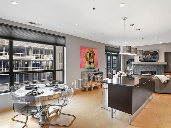 Stylish condo located across from Lake Calhoun (Bde Maka Ska) with private balcony and SE facing views. Maple floors and trim, granite counters, tiled backsplash, soaring ceilings, stainless steel appliances. Also, features granite island with breakfast bar and space for dining table. Fabulous tiled bath has separate tub and shower and double sinks. Plus, walk-in closet, in-unit washer and dryer, underground heated garage, and incredible newer gas fireplace. Convenient location near the City Lakes, Restaurants, The Greenway Bike Path, and more!