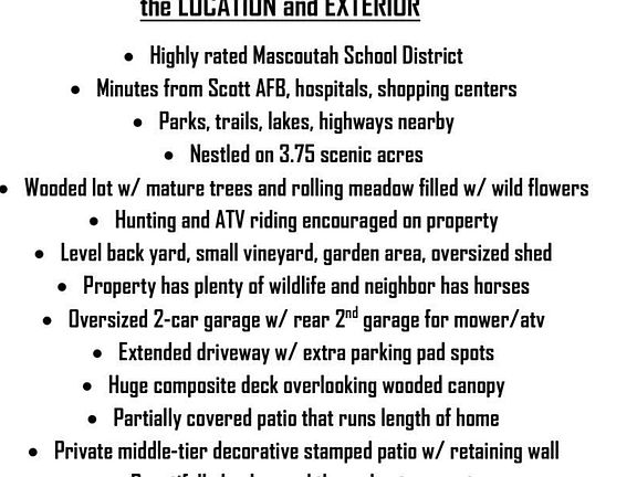 Honor awaits the next family to perpetuate this impeccably cared for 3.75 acre Estate that's nestled on a quiet hillside in Shiloh Valley. You will immediately fall in love & understand why this property has been under the same ownership for decades. Spring is ready to unveil it's full beauty in bloom with both flora and fauna alike. This 3bed, 3bath Ranch home w/ walk-out boasts over 3,000sqft of manageable living space & an open floor plan. You will be amazed at its soaring cathedral ceilings, ornate fireplace w/ marble surround, & stately wood trim throughout. Other highlights are the oversized Sun Room teeming w/ natural light, the main floor Master Bedroom Suite & laundry room. The finished lower level features tall ceilings, a rec-room, abundant storage & a second garage for ATV's or mower. Out back is perfect for BBQ's, hunting, or just hanging out. Minutes from Scott AFB & much more. Plz check out the Feature Sheet in the pics! Come experience the good life in Shiloh Valley. Additional Rooms: Sun Room