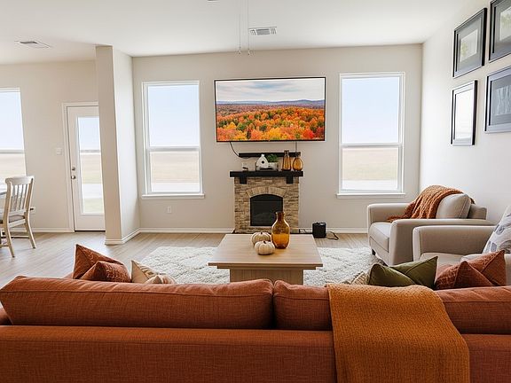 The open floor plan feels bright and welcoming, with a kitchen designed for gathering, granite countertops, stainless steel appliances, a large island, and the refrigerator stays.