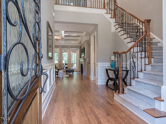 Prominently poised on EXPANSIVE CORNER LOT with GRAND SEMI-CIRCLE DRIVEWAY in NW Cary's peaceful DUNHILL neighborhood this beautifully appointed CUSTOM-BUILT ESTATE HOME features bright & open floor plan & amazing connected INDOOR-OUTDOOR LIVING. Enjoy the serenity of a FENCED PRIVATE BACKYARD oasis & indulge in the elegant details this signature home offers. Designed to accommodate flexible WORK FROM HOME lifestyle. RTP - 10 min. RDU - 17 min. The perfect balance between tranquility & coveted direct access to the paved AMERICAN TOBACCO TRAIL!! You don't have to think about it because it's already here! Over $130,000 of exceptional upgrades have been added to this lovely home for you to enjoy. Two-story foyer showcases exceptional millwork & natural site-finished hardwood floors, 10 ft+ ceilings & 8 ft doors. Your gaze is drawn through HUGE GREAT ROOM w/coffered ceiling, built-in bookshelves, cabinets & fireplace towards the expansive screened porch & inviting backyard. Glass-paneled French doors open to a versatile DINING or PRIVATE OFFICE flex space w/tray ceiling. GOURMET KITCHEN w/massive 9 ft 4-top ''white ice'' granite island. SEPARATE BREAKFAST AREA. Storage galore in large WALK-IN PANTRY w/COFFEE BAR. Expansive 1ST FLOOR PRIMARY SUITE w/tray ceiling. Lux bath w/DUAL VANITIES, DUAL SHOWER HEADS & RAIN SHOWER. Generous WALK-IN CLOSET w/built-ins & SAFE ROOM you have to see! There's also a 1ST FLOOR GUEST SUITE w/walk-in closet, ensuite & side door to deck & HOT TUB! Upstairs 3 BEDROOMS & 2 FULL BATHS! Flex two bedrooms into work from home offices or a fitness room. HIGH END THEATER ROOM w/surround sound & themed lighting features LIGHTED WET-BAR w/beverage fridge & microwave. Great for a night at the movies! Double set of full-view French doors opens to HEATED & SCREENED PORCH connecting Great Room into huge indoor-outdoor space. Porch features separate entertaining & dining areas, upgraded flagstone floor, tongue & groove wood ceilings, integrated sound system, ceiling fans, custom sun shades, COMMERCIAL GRADE INFRARED HEATERS & gas fireplace for year-round enjoyment!! Porch overlooks expansive CUSTOM PATIO & beautifully landscaped backyard w/BLACK ALUMINUM POOL-HEIGHT FENCE screened w/arborvitae. Terraced deck boosts 7-seat, step-in BULLFROG HOT TUB w/privacy screen!! Additional luxuries: Control4 SmartHome monitored security/surround sound/lighting/4 infrared cameras w/16 Terabyte recorder! Whole house is high speed LAN wired! Ubiquiti wireless data network! Central Vac! Smart Irrigation! Low Voltage Landscape Lighting! Sealed & conditioned crawl space! UV Air Filtration Scrubber! 400 amp electric! 22x15 bonus space is expansion ready w/rough flooring, wall studs & wiring! Schedule a showing today to experience luxury living at its best!