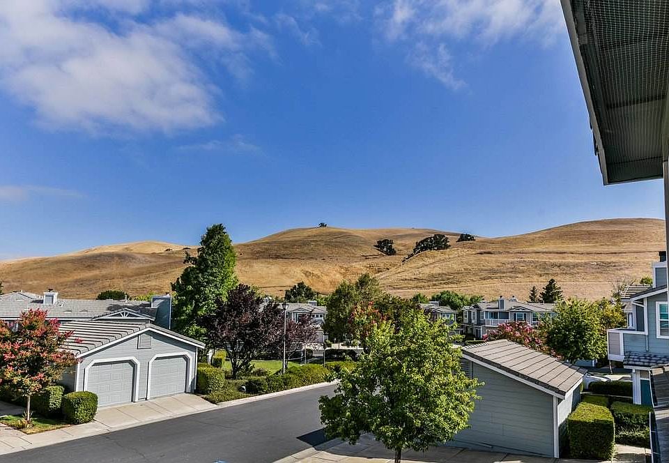 Price Reduced! NOW is the Time! Beautiful VIEWS of the hills! This gorgeous home-END UNIT-boasts high ceilings, fresh paint, newer laminate flooring and two, 1-car garages. 1 garage has direct access into the home & a 2nd detached garage. The spacious master bedroom features a lovely archway and an enormous walk-in closet with built-in organizers, dual sinks and a soaking tub. French doors open to the second bedroom or den. Light and bright kitchen with plenty of cabinets, white appliances, tile floors & counters and a gas range. Indoor laundry is located in the hallway closet. Enter on the first floor and all living space is on the second floor. Serene views of the hills from the family room, bedrooms and balcony. Low HOA dues w/a community pool and a basketball/volleyball area. Enjoy the Lifestyle of Clayton: a charming community, great schools and excellent access to outdoor activities of parks, Clayton Creek and Mt Diablo! Per HOA Docs: CAN be rented.