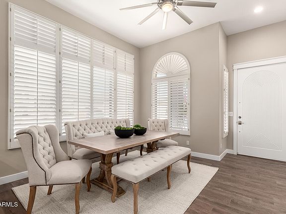 Remodeled with customized floor plan in gated community. Enter home through a custom front screen door into an open floor plan that is great for entertaining. White Shaker stacked cabinets with crown molding in kitchen & baths, quartz counter tops T/O the house, Thermador cabinet-faced dishwasher and dual energy gas/electric stove/oven with stainless hood. KitchenAid cabinet-faced refrigerator & drawer microwave in 8 ft paneled island, farm sink, coffee bar area, 2 pantries, one walk-in & other cabinet with roll out drawers. Subway tile and R/O. ''Just the right sized'' main living space adjacent to the kitchen has a niche for your couch & a picture feature wall. (SEE MORE) The primary suite features a slider to the covered patio and large walk-in closet. The bathroom has a seamless shower enclosure, 2 sinks, Toto toilet & a ceiling fan. The secondary bath includes 2 sinks, a bathtub and Toto toilet. The white plantation shutters set off the soaring 12' ceilings with the neutral custom wall color choice. White 4.5'' baseboards & custom door trim. Check out the beautifully textured and easy care wood like tile everywhere except for the secondary bedrooms, which have berber carpet. 8' interior doors. All the bedrooms have matching ceiling fans. One of the larger backyards in the neighborhood features a private pebble-tec pool, always green grass, a covered patio and a bonus larger patio. So many other upgrades that you MUST SEE FEATURE SHEET in Documents tab.
