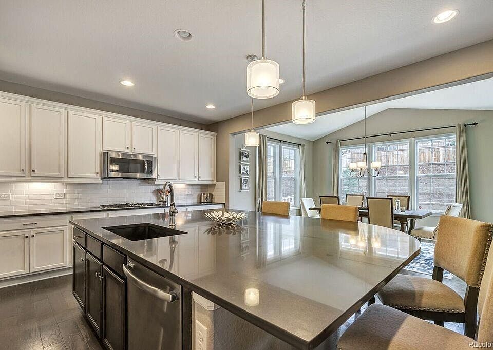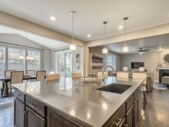 WOW! Love upgrades? It's all HERE! Beautiful 2 year old home features sun room, 4 bedrooms, study, loft, open floor plan. Located within The Meadows in Historic Castle Rock, residents enjoy world class amenities at The Grange and so much more. The community offers schools, parks, and lots of recreation that rival the best of the best in Colorado. This well-maintained home has real hardwood floors, a show home kitchen fit for a magazine with a huge quartz slab island, upgraded stainless appliances with double ovens, gas cook top, upgraded cabinets with soft close/under cabinet lighting/pendant lights/large pantry. The great room has gas fireplace and is wired for surround sound. SS wired at back patio and loft. Wrought iron railing, upgraded SILK carpet and pad, master suite features tray ceiling with crown molding, and 5 piece deluxe master bath. Step out onto the covered back deck to enjoy the fresh new landscaping and gas line to BBQ grill. This home has it all! Must see!