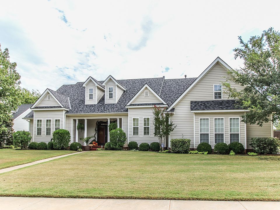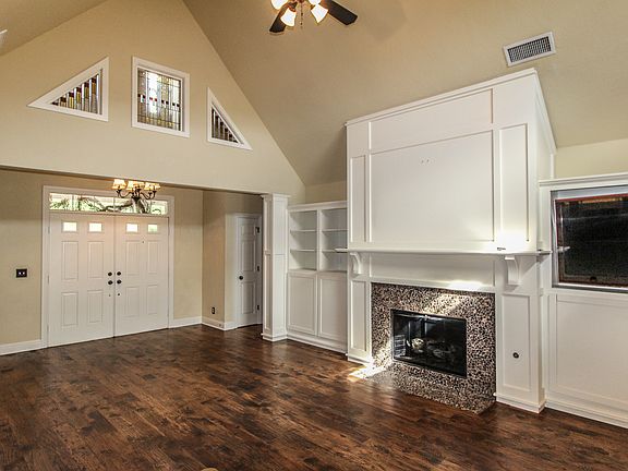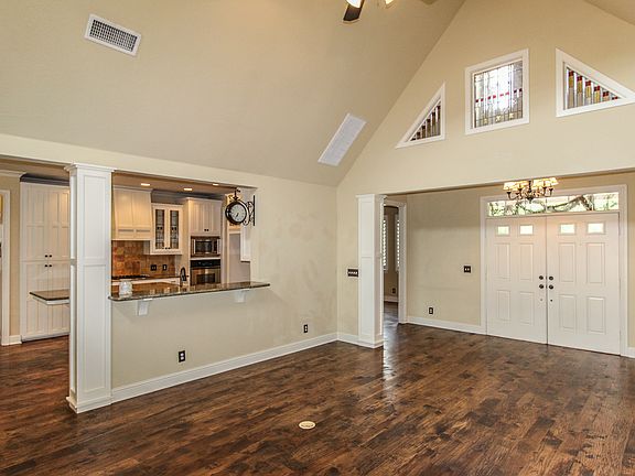 Soaring ceilings! Hand scraped hickory wood flooring. Crown molding and ceiling fans throughout. Stained glass insets in windows and kitchen cabinet doors. Pull out shelves and drawers in kitchen. Plantation shutters. Lots of storage in all rooms. Decked attic. Approx 10' French hutch in dining room. Big screen television remains, as does TV on back deck. Extra large covered deck. Swing set in back yard to be removed.