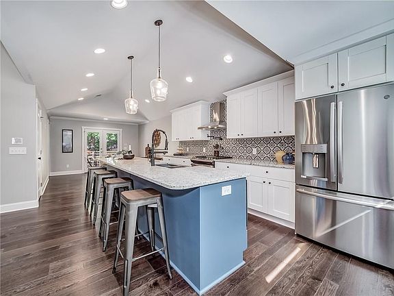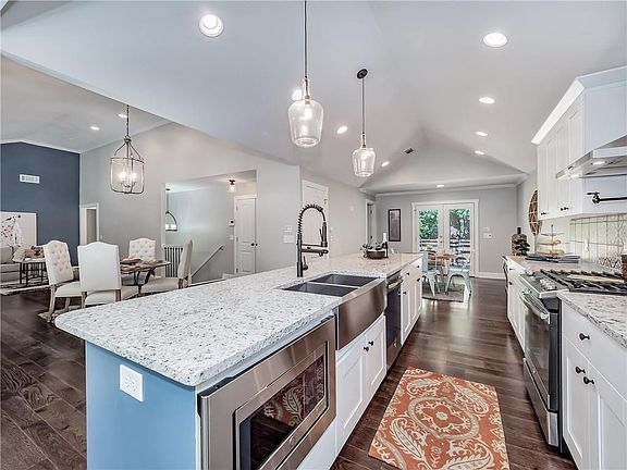 - Kitchen Features: Breakfast Bar, Pantry, View to Family Room, Stone Counters, Kitchen Island, Cabinets White