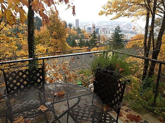 Cozy home nestled in greenspace at end of a lane with off-street parking and views of downtown/river/ Mt. Hood/Mt. St. Helens. Free range chicken grazing area and many gardens. Updated with gas fireplace, hdwood floors, crown moulding, large decks and new kitchen in 2007 (cherry cabs,/granite counters/steel appliances/gas). Attic refinished as closet and an office nook.