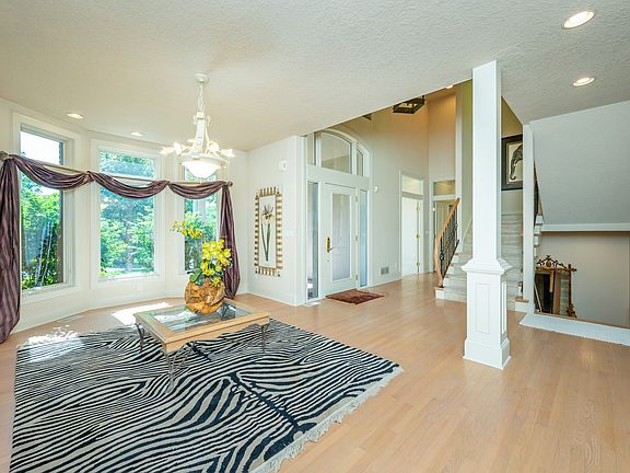 Experience refined living in this exquisite story-and-a-half home, nestled on a private, deep lot in an exclusive executive neighborhood. Custom woodwork and stunning barrel ceilings set a sophisticated tone in the expansive kitchen, complete with a cozy sitting area perfect for entertaining or relaxing in style. The main-floor primary suite features a private deck with serene views of the park-like yard, offering a tranquil retreat at day's end. Soaring windows flood the home with natural light, framing lush, landscaped surroundings. A walk-out basement offers room to expand and personalize. This home blends craftsmanship, comfort, and unmatched privacy luxury living at its finest.