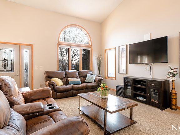 This wonderful WATERFRONT Home is under 500,000! From the minute you step into this 1 1/2 story home, you will feel welcomed into a warm and entertaining home. Ideal main floor laundry and master bedroom suite allows one to live on main floor & expand into upper & lower levels only when needed. The main floor features soaring ceilings in the living room, maple kitchen cabinets & granite counter top on the center-island. For convenience there is a ½ bath off the heated triple car garage w/floor drain & water! The upper level allows space to work from home in the comfortable loft area plus there are 2 bedrooms with Jack & Jill bath! The lower level family room and game space w/wet bar is the perfect place to entertain! Additional features include: newer furnace (2018) & dual zone heat, & solid core doors! There is no better place to enjoy summer than in the backyard or on the sandy beach of this wonderful home!