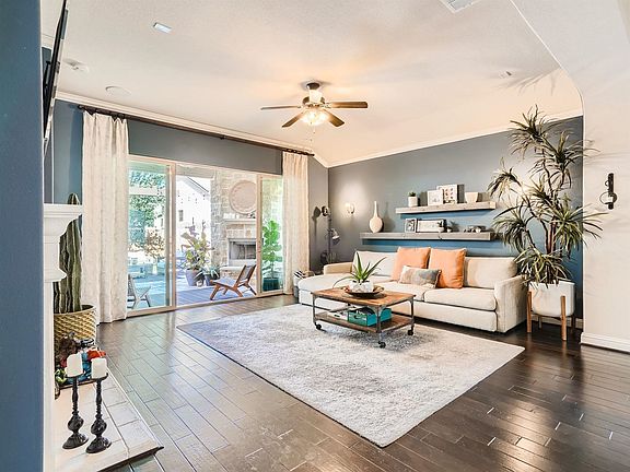 **Model Home** Welcome to this exquisite 2,443-square-foot previous model home with captivating design to elevate your living experience. Boasting 3 bedrooms, 2 baths, a dedicated office, and a flex room for an exercise room or sitting area, this home offers unparalleled comfort and functionality. Step into the heart of luxury with a gourmet kitchen featuring Kent Moore custom cabinets, pan slide-out shelving, and 42" painted and glazed Frosty Maple cabinets with a dark glaze. The kitchen also showcases a Center Island with Level 5 granite countertops, graphite Deep-Well Single Bowl Sink, Monogram stainless steel appliances, with an extended Butler service counter with base cabinets, upper wine rack, and plate rack cabinets. Enjoy the warmth of wood floors in the kitchen, living room, hallways, flex space, and office space, complemented by 8-foot interior beadboard doors and wood-beamed ceiling in the kitchen and dining area. The living room welcomes you with a gas-burning fireplace and crown molding. Indulge in outdoor living with an extended concrete patio featuring a beamed arbor accent, an outdoor built-in barbecue grill, and a gas stone fireplace. The mature landscaping, zoned sprinklers, and covered patio create a serene and inviting atmosphere. The master bedroom is a retreat with a bay window, tray ceiling, crown molding, and designer carpet. The ensuite master bathroom features custom drapes. This home is thoughtfully equipped with modern conveniences, including Cat-5 Ethernet wiring throughout, pre-wiring for a security system, security windows and doors, and home speakers in the living room, master bedroom, and master bathroom. The garage is a functional space with painted and coated flooring, storage racks, and built-in cabinets. Additional features include 8' wood and wrought iron with a glass front entry door. Experience the epitome of sophistication and comfort in every detail of this model home, where luxury meets functionality in perfect harmony.