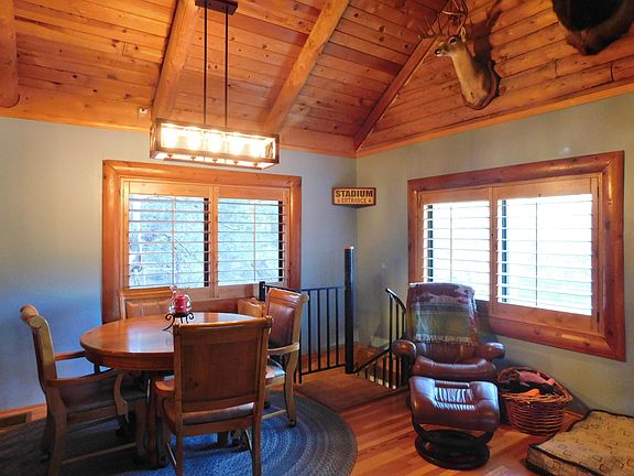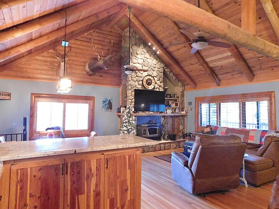 Rustin mountain cabin on 0.58AC in Pine! Warm cabin vibe with this 5 Bedroom/2BA/3CG which is 32x32! Approximately 2160sf of living space. Main level is a great room with a wood burning fireplace, wood floors and kitchen with granite countertops. Two bedrooms and one full bathroom. Loft has spacious bedroom and downstairs is a bonus family room/game room with two more bedrooms and one full bathroom. Private entrance to the yard. Central heating and cooling, dog run, paver driveway and a massive 1024sf garage with electrical charging port for an electric car. There is a 32'x10' bonus space above the garage with electric and 7'5'' in height that can be completed for additional space. Property has tall pines, a paved road and a massive covered front porch! Truly a one-of-a-kind property!