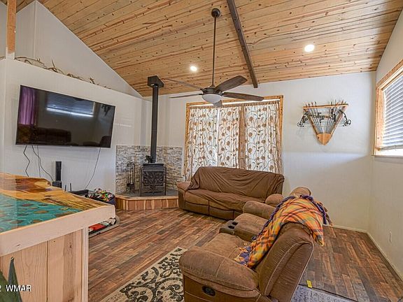 Off the grid living at its finest! Home features custom wood details in both living room and kitchen. Vaulted ceilings with T & G. Custom counters in the kitchen, and oak cabinets. Unique custom bathroom is a must see! Large workshop with power. Two stall barn with turnouts. RC car track. Plenty of room with 19 acres surrounding the home. New well. All new batteries on solar system. EXTERIOR REPAINTED JUNE 2022 Plenty of room to build larger home or just enjoy the easy living that this property offers. 15 minutes from downtown Show Low AZ