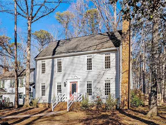 Phenomenal Two-Story Transitional Home on Private Cul-De-Sac Lot in Huntsbridge of Brandermill! This stunner flaunts 4 BR, 2.5 BA, 1,674 sq ft, 1st floor BR, updated kitchen, decorative molding & spacious backyard! Setting the stage, be wowed by picturesque front porch beckoning inside a stellar floor plan. Be greeted by breezy foyer flanked by expansive family room w/gorgeous HDWD flooring. Around the corner, you will find a dreamy kitchen decked out w/quartz counters, smooth top cooking, SS appliances, tile backsplash & access to rear deck. Sweep effortlessly to open dining room w/wood-burning FP &stylish brick surround. Buyer's will also enjoy 1st floor guest BR w/adjacent 1/2 bath, ideal for hosting in-laws! Retreat upstairs to pristine primary suite flaunting crown molding, large walk-in closet & private en suite bath w/tile flooring, walk-in shower & oversized granite vanity. Two spacious secondary bedrooms each offer plush carpet & walk-in closets, sharing full BA w/tub/shower and large vanity. Satisfy all your storage needs in pull-down attic as well as detached storage shed. Take a peek at the incredible outdoor space showcasing privacy fence & large deck for entertaining!