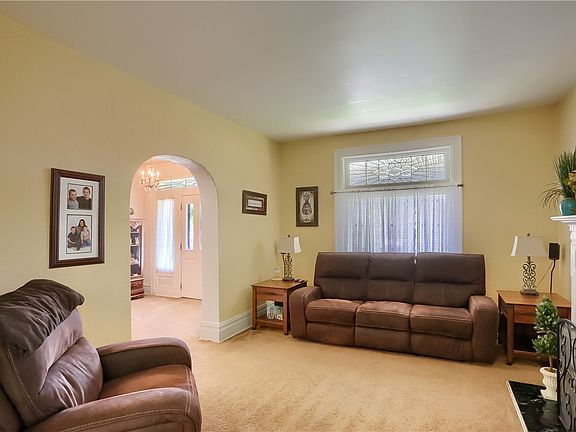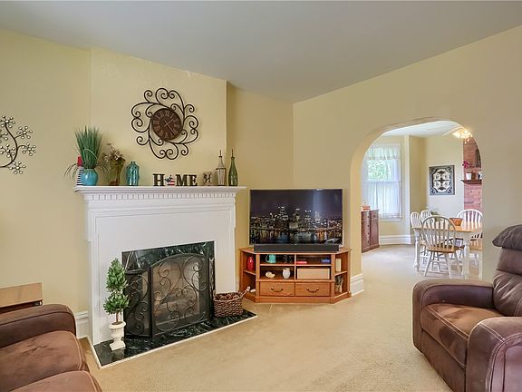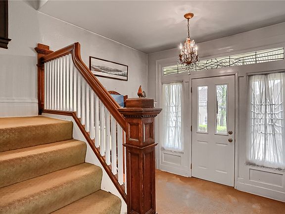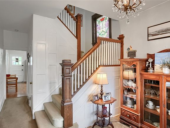 Beautifully situated brick home boasts a charming porch and original character throughout. Greet guests at the striking front door with beveled glass transom and large sidelights. A spacious foyer has original wood detailed staircase, stain glass window and stylish chandelier. Arched entryway flows through to the family room featuring a decorative fireplace, large window with detailed transom and a neutral tone. Adjacent is the dining room with a bay window, stain glass feature, ceiling fan and a brick deco fireplace. Chef’s kitchen has modern flooring, gas stove, ceiling fan, large pantry, access to the lower level with laundry and access to the rear patio and yard. Ascend to the generously sized primary bedroom with a window seat and walk in closet. Guest bedrooms have ample storage, ceiling fans and unique ceilings. A shared hall bathroom features a tub/shower combo. Relish in the expansive rear yard and patio. Plenty of space for all to enjoy!