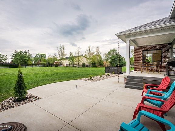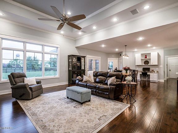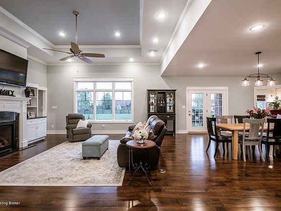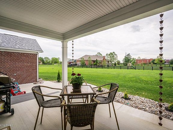 Thoughtfully designed, like new custom build with an open floor plan utilized as a 5 bedroom, 5.5 bath ranch on over an acre flat lot. Every detail was well planned to create the perfect, efficient space and features for large gatherings and ever day living. This meticulously maintained property offers all first floor living and the finished basement extends your living space with private suite options and another open family room with game room area and flex spaces. Beautiful views are accessed from the stylish windows throughout the home and the front sitting porch, covered back porch and patio on the quiet cul de sac. Soaring ceilings, surround sound, a security system, an open kitchen, dining space and family room with fireplace and built ins, a walk in pantry with second refrigerator, a large mud room, a cozy sunroom, private bedroom suites, highly sought after finishes and a flexible floor plan are some of the many extras and benefits of this amazing home. The family is relocating and have enjoyed creating this rare find in desirable Oldham County.