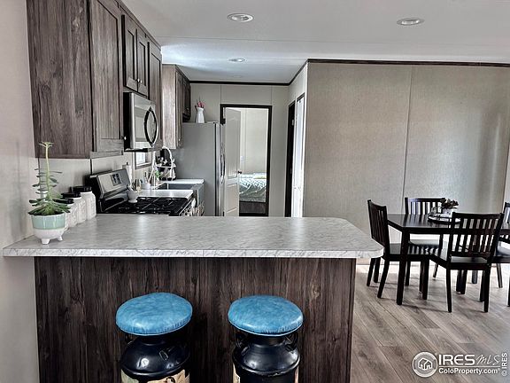 Villas Community is Ft Collins newest and nicest. Safe and Secure, this boutique haven is very private and secluded in a residential area. With full time onsite management, the community features new wide streets, beautiful landscaping and all new homes. The resident friendly ownership offers below market lot rent of $825 / month. Park allows for small inside pets. Dogs must be under 25 pounds and be approved by management. The home is only 2 years old, well maintained and shows like new featuring an open floor plan with 8 foot high ceilings, energy efficient windows, deluxe appliance package, washer / dryer connections, ceiling fans and Central AC. Kitchen is open and spacious. A chef's dream. Park allows for residents to do custom landscaping with management approval of design and location. Raised garden beds, flowering shrubs, grass area for pet.